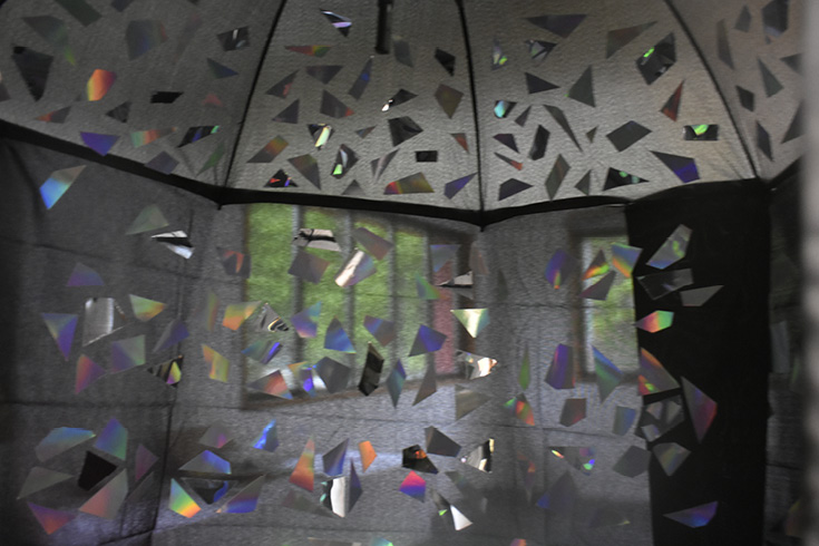 Ces dispositifs créés par les étudiants dialoguent avec les expositions du Centre d’art, comme c’est le cas pour ce travail pensé en lien avec l’exposition Voyages en kaléidoscope d’Érik Bullot.