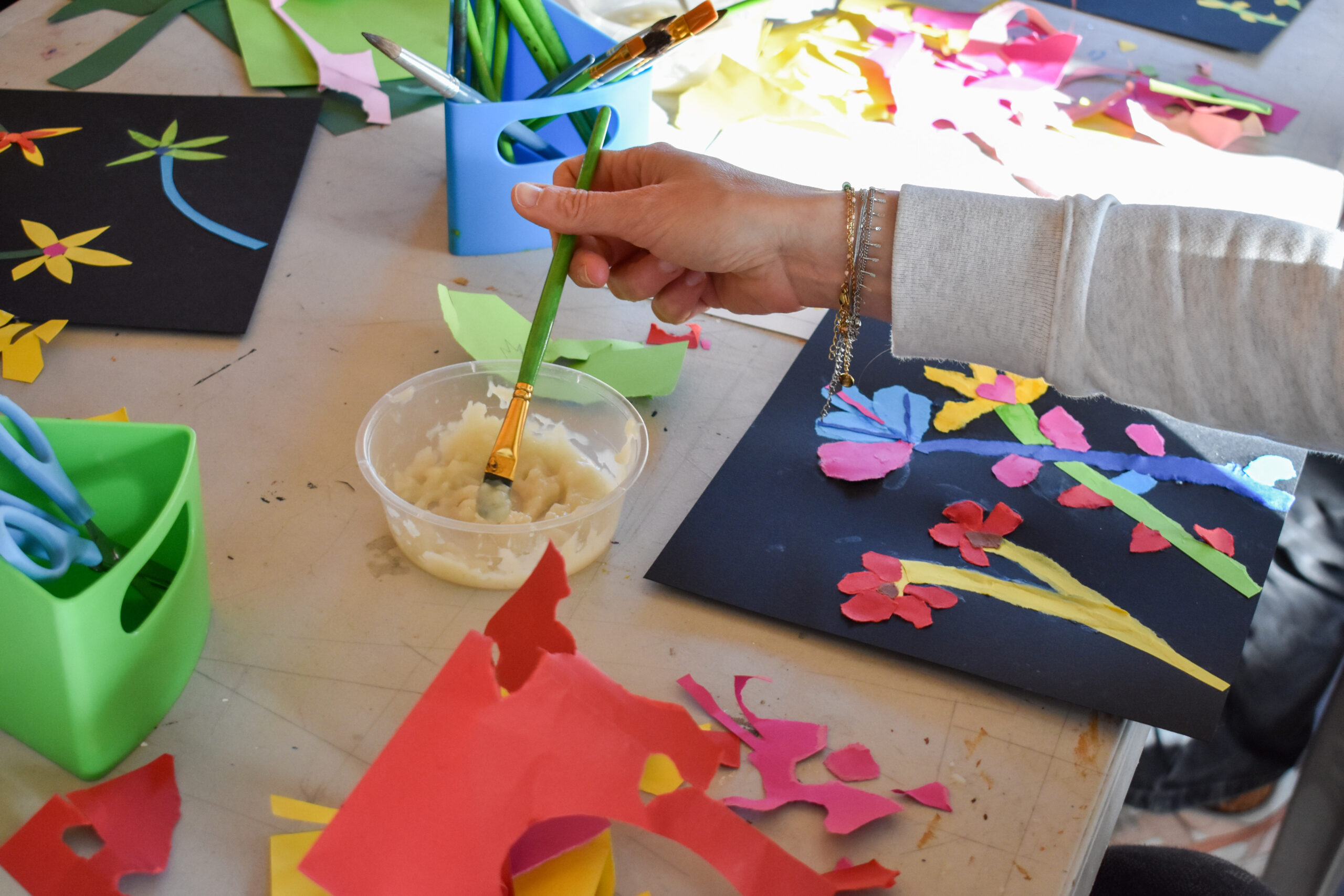 Après une phase de croquis dans l’espace d’exposition, travail de collage encadré par un médiateur-plasticien.