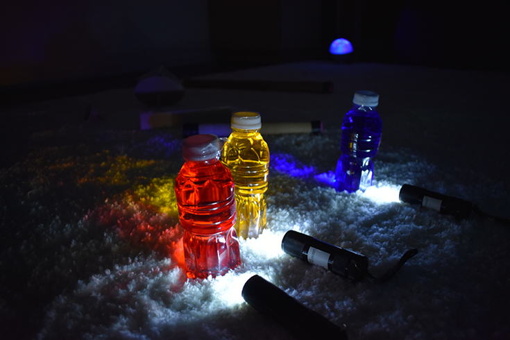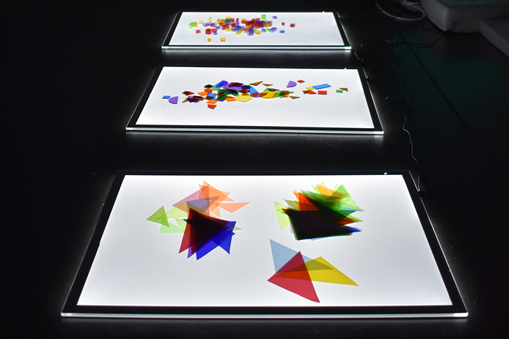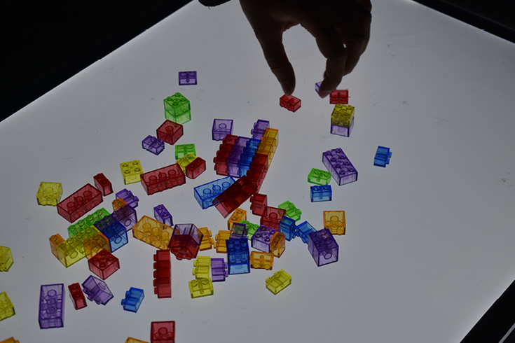 Des formes colorées disposées sur les tablettes lumineuses invitent à être manipulées par les publics.