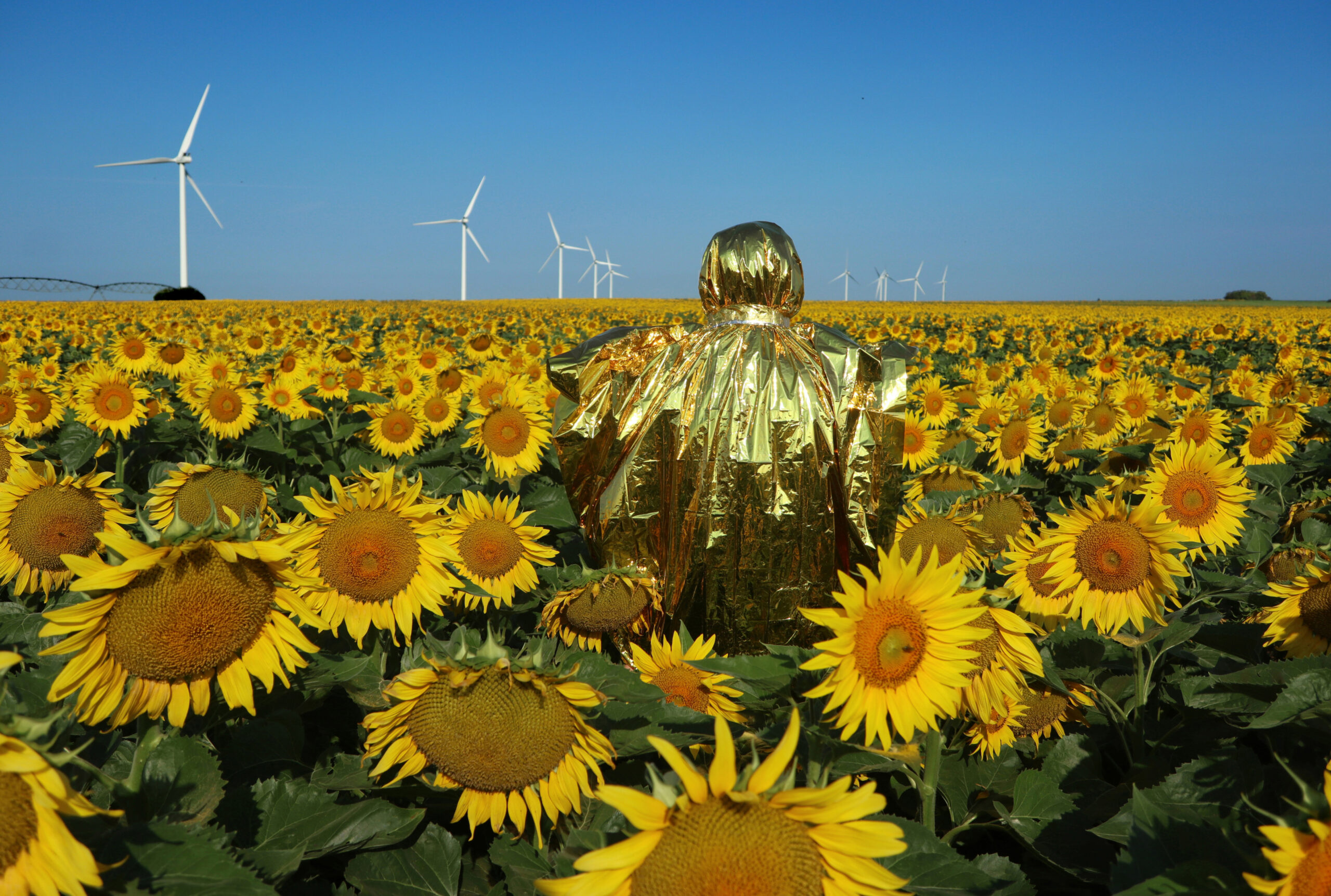 La vidéo Shooting Star prolonge ces thèmes de la vanité, de la fragilité et de l’adaptation. Au milieu d’un champ de tournesols, face aux éoliennes, l’artiste, enveloppé d’une couverture de survie dorée, tourne sur lui-même jusqu’à sa chute. La mécanique du monde et la vulnérabilité du corps s’y répondent dans un même souffle cosmogonique : un geste rituel, à la fois dérisoire et sacré, qui fait écho aux sculptures modulables et aux mobiles suspendus. Ensemble, ces œuvres interrogent le temps, le cycle de la vie et la transformation.